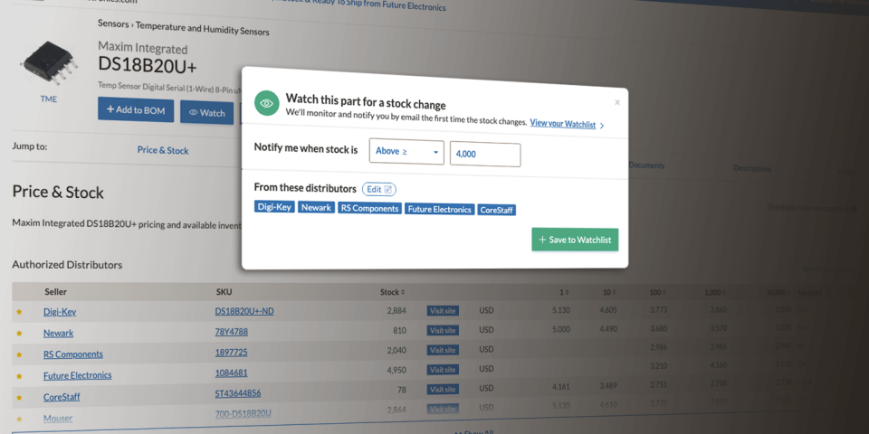 在Octopart,我们持续致力于改善用户的零件搜索体验和我们的供应链信息。作为这项持续工作的一部分,我们创建了库存通知功能。作为注册用户,您现在可以设置通知,以便随时了解您选择的任何零件的库存水平。 当您准备将设计投入生产时,最不希望发现的是在需要零件时突然无法获得供应。通过我们的库存通知,我们会让您了解不同种类的库存变动,这可以帮您节省因最后一刻的变更而产生的高昂成本。最简单且最常见的情况是,当一个零件的库存不足以满足您的需求,因此您必须等待补货。其他例子包括您经常使用且需要在库存水平过低之前采取行动的零件,以及您有兴趣测试但尚未上市的新零件。 设置您的通知 我们将深入探讨每个库存水平的例子,但首先,您如何设置库存通知呢?如上所示,当您在Octopart.com上搜索MPN或关键词时,您会看到一个搜索结果页面,列出了零件选项、携带该零件的分销商、他们的库存数量等。一旦您选择了认为最合适的零件,您将能够看到有关该零件的更多详情。在这个页面上,您可以为该特定零件/报价设置通知。在页面顶部,您会看到一个名为“Watch”的蓝色按钮。点击此按钮后,系统会提示您选择此通知的偏好设置。您将选择您希望的库存阈值(高于或低于)、库存数量以及您希望被提醒的分销商,如果不是您预先选择的首选分销商的话。 观察列表 您还可以从用户仪表板访问您的完整观察列表,在那里您可以编辑和删除已设置的任何通知。如上所示,当您访问您的观察列表时,您会看到一个列出您当前正在观察的所有零件的列表。您可以单独进入每一个零件并编辑您的库存阈值和数量,以及您的分销商和个别报价。您也可以删除观察列表上列出的任何现有通知。 库存水平警报示例 为了更好地理解何时设置通知以及在哪个阈值设置,这里有一些现实世界的例子。首先,是所谓的补货提醒。这款STMicroelectronics微控制器,和许多微控制器一样,由于芯片存储问题,目前在所有分销商中的库存都很低。这是用户可能想要设置“高于”通知的一个零件,以便在零件库存高于0、100或他们希望的数量时提醒他们,这样他们就可以趁热打铁了。 下一个例子是低库存警报。陶瓷电容器是一种广泛使用的部件,在2018年很难找到,但从那以后变得更容易采购了。正如你在这个 Murata陶瓷电容器的零件详细页面上看到的,截至今天(2021年5月20日),几家分销商有这个部件的库存,但这些数字可能会随着需求的增加而稳步减少。如果这是你在许多设计中经常使用的一个部件,你可能想要设置一个警报,以便在库存低于某个特定水平时通知你,这样你就可以趁机购买,或开始寻找替代部件。 最后一个例子是当你想要测试的新部件即将上市但尚未通过分销商提供时。这款Texas Instruments集成电路是一个尚未可购买的新部件的好例子。正如你所看到的,Digi-Key列出了该部件但尚无库存。这是你想要设置通知的地方,以便在库存“高于”至少1时被提醒。 要开始使用库存通知,请在 这里登录或注册并开始搜索。如果你有任何反馈,请随时通过 contact@octopart.com与我们联系。